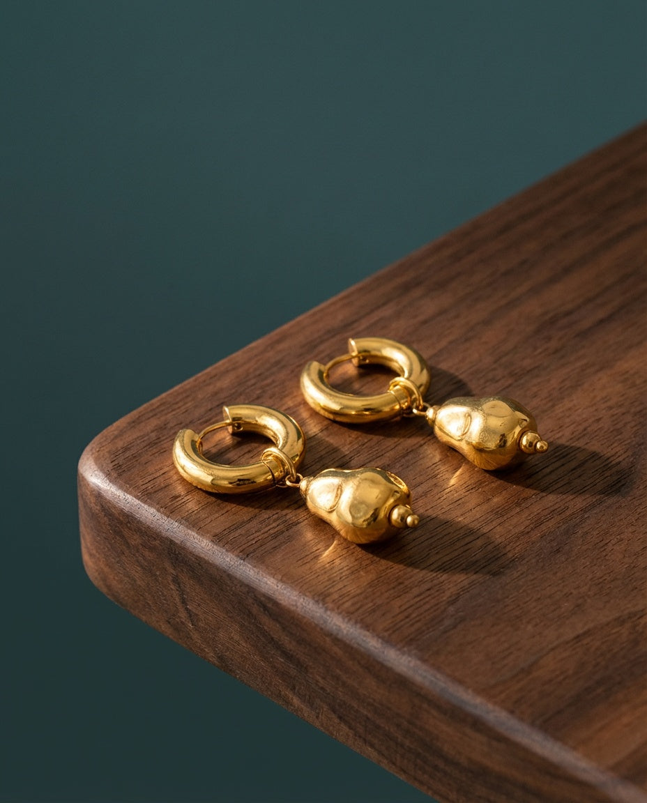 Inspired by the fluidity of nature and the beauty of organic forms, the Ubuhle earrings, meaning beauty in Zulu, bring sculptural elegance to your collection. The molten-like gold drop, suspended from a chunky hoop, creates a mesmerizing interplay of texture and movement. These earrings celebrate the art of embracing imperfections and making them your own.